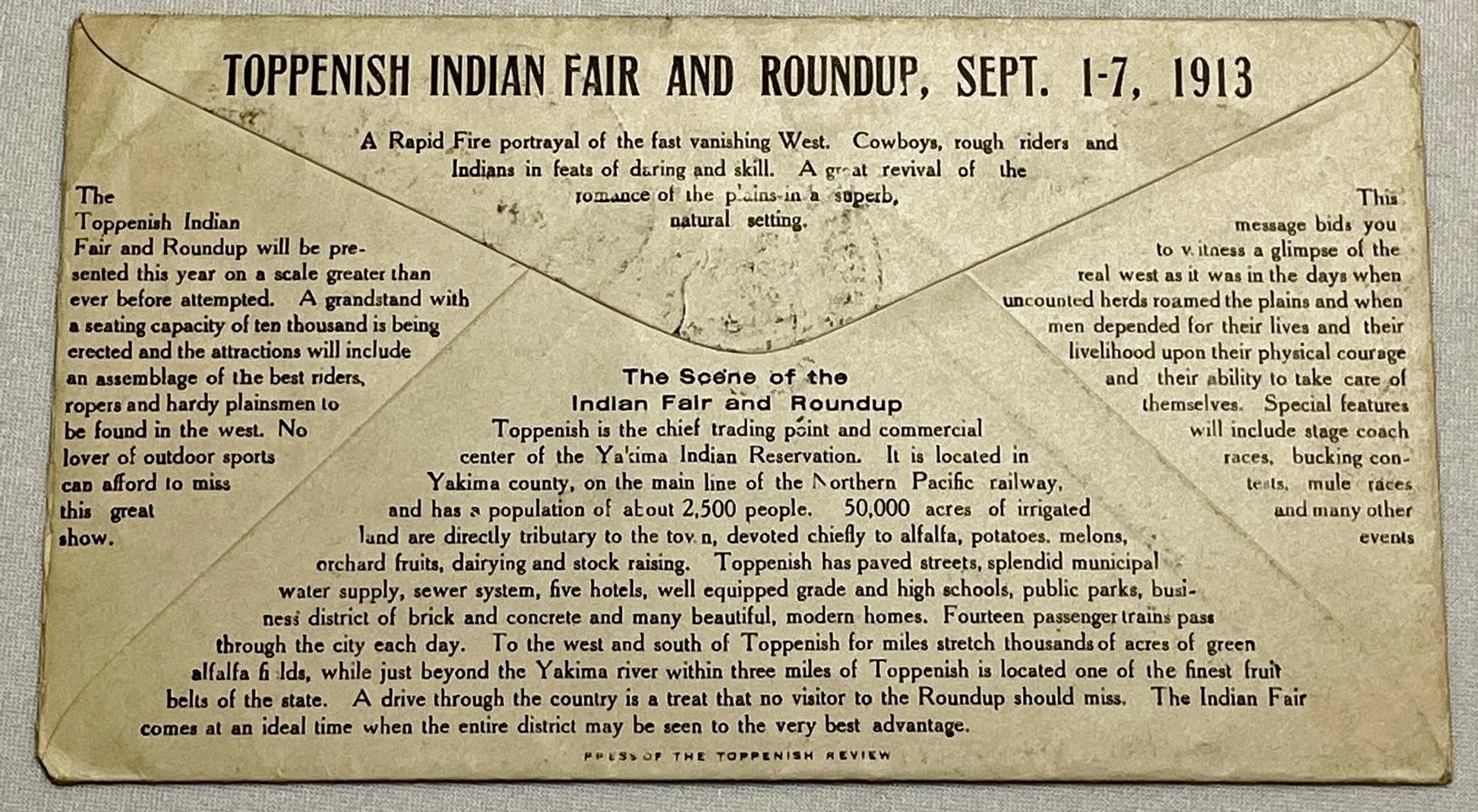 Antique 1913 Toppenish Indian Fair and Roundup September 1-7, 1913 Hotel West Advertising Postmarked Envelope